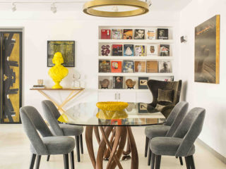 Nous l’avons également imaginé comme un vaste de lieu de réception chic, sophistiqué mais décontracté à l’image du propriétaire. L’immense sofa arrondi et sa table basse Yves KLEIN constituent une scène « rock’n’roll » avec un symbole rebelle Aigle doré en résine et taggué de l’artiste anglais Jimmy Martin. Une scène ou artiste et jeune gens de l’Est-London discutent, s’amusent et font la fête.