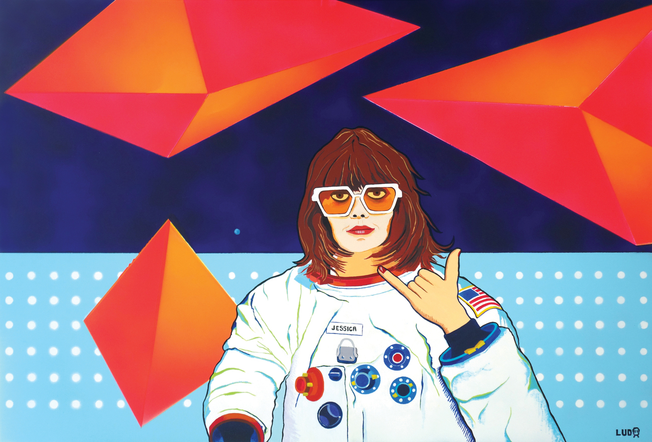 Je viens d’achever une toile intitulée On the Moon, autour d’une femme astronaute. Le rôle des femmes dans la société m’inspire beaucoup. Techniquement, je travaille l’aérosol pour les fonds, puis l’huile pour les détails.