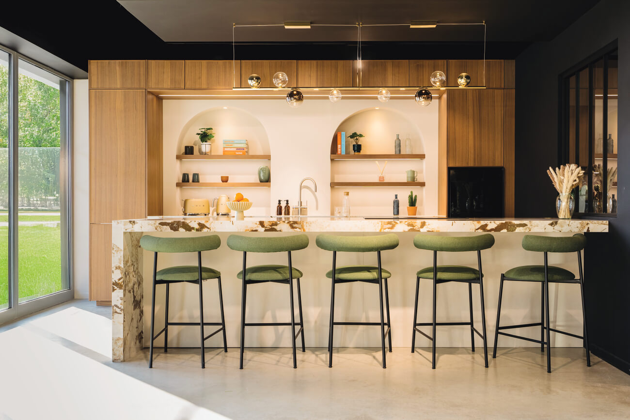 Dans cette logique, la cuisine devient souvent le point de départ du projet. Îlot central monolithique, plans de travail en céramique, intégration discrète des technologies et solutions de rangement intelligentes transforment cet espace en véritable cœur de la maison, à la fois convivial et performant.
