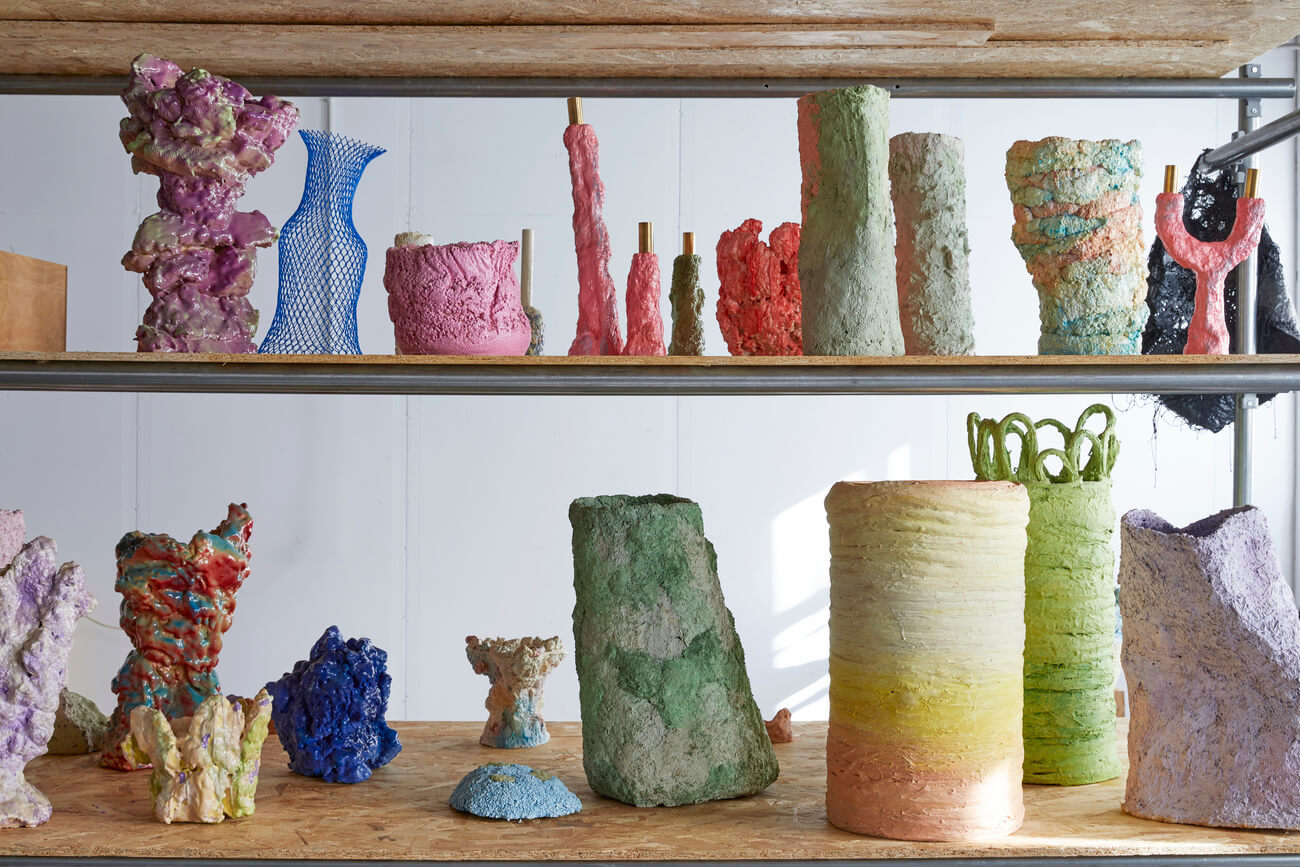 Influencée par Gaetano Pesce ou Ruth Asawa, elle laisse la matière guider la forme. Une chaise naît d’un assemblage de fragments, une lampe de couches textiles compressées, un vase de fibres et de sable.